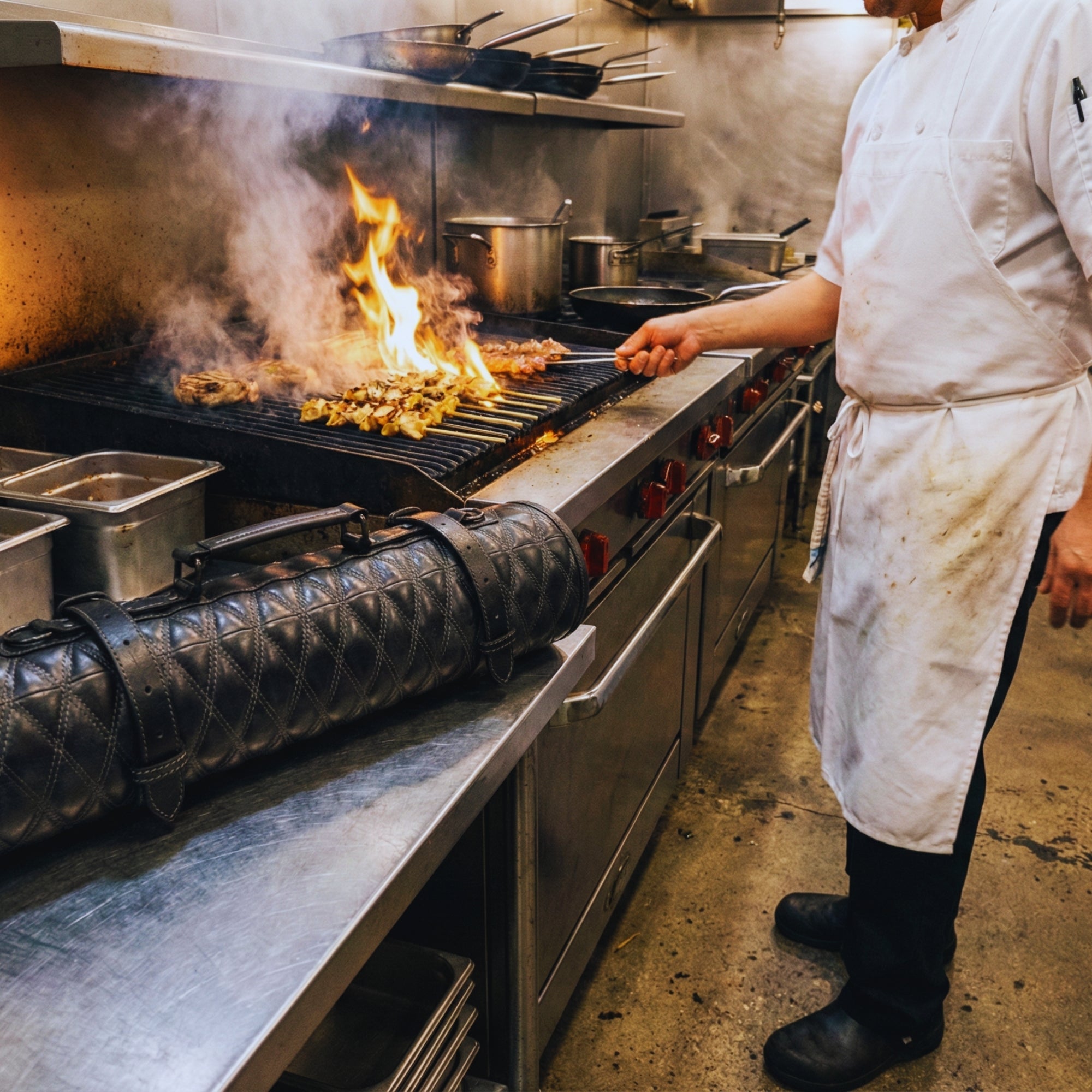 Experience the Arctic Blade Quilted Leather Knife Roll by Aaron Leather Goods, a stunning combination of elegance and practicality. Safely store and transport your valuable knives in this meticulously crafted leather roll.