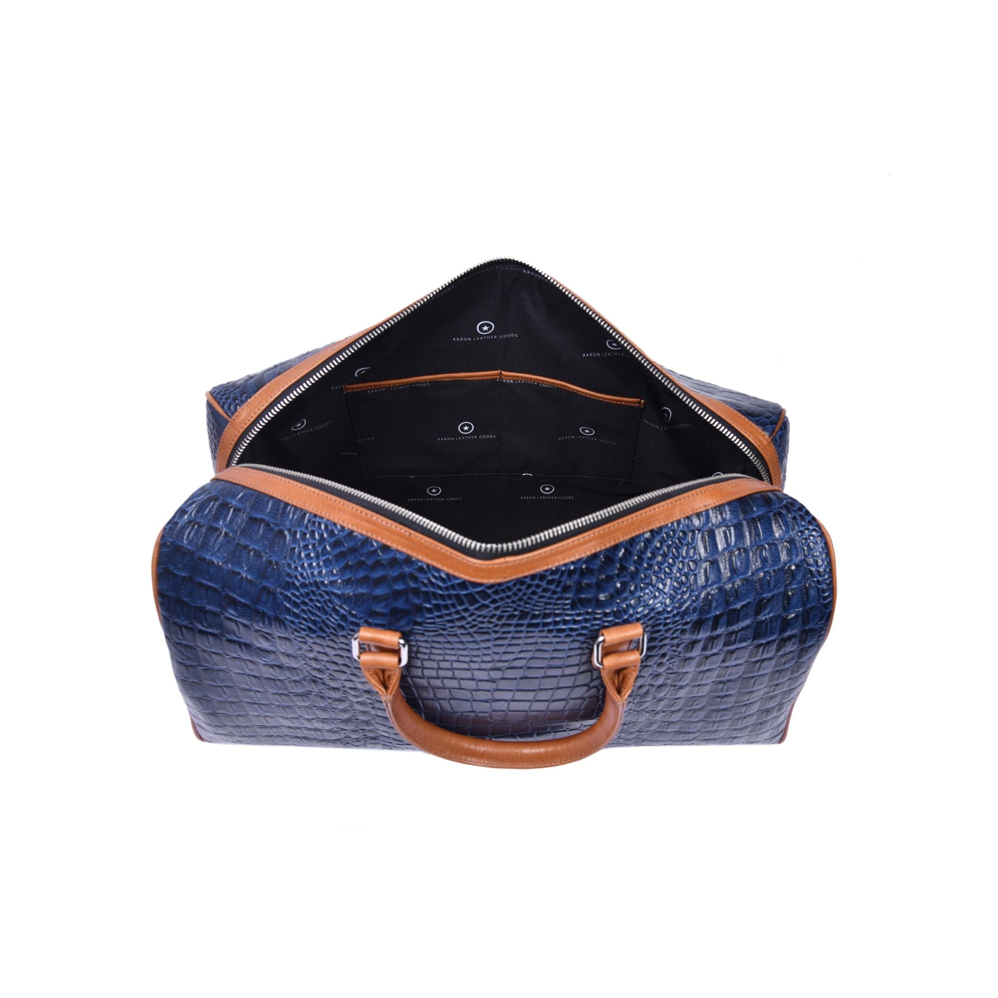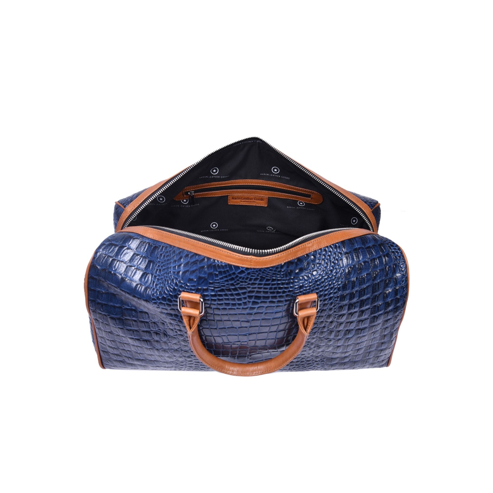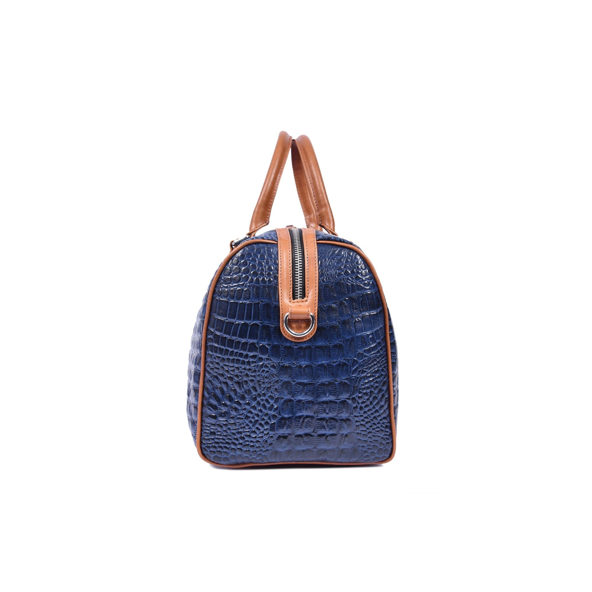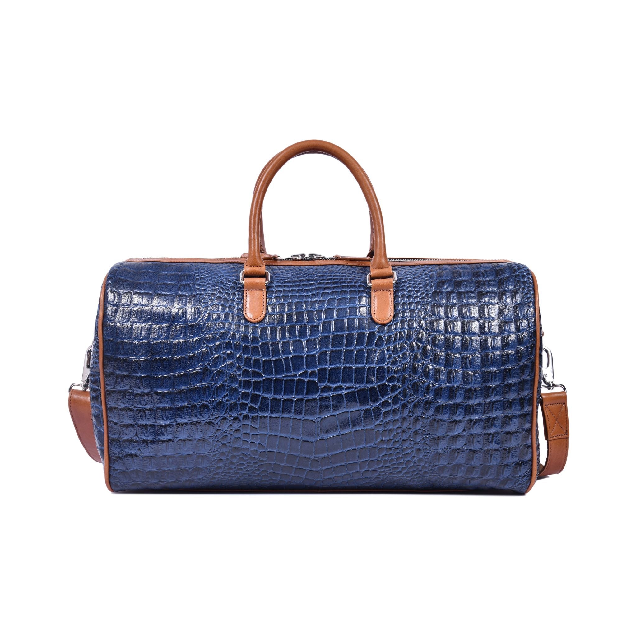 Elevate your travel style with this premium blue croc-pattern leather duffle bag, designed for those who appreciate luxury and functionality. Crafted from high-quality leather with a rich textured finish, this bag offers a spacious interior to carry your travel essentials with ease. The contrasting tan leather handles and adjustable shoulder strap add comfort, durability, and timeless appeal. Perfect for weekend getaways, business trips, or gym use, this duffle blends sophistication with everyday practicality.