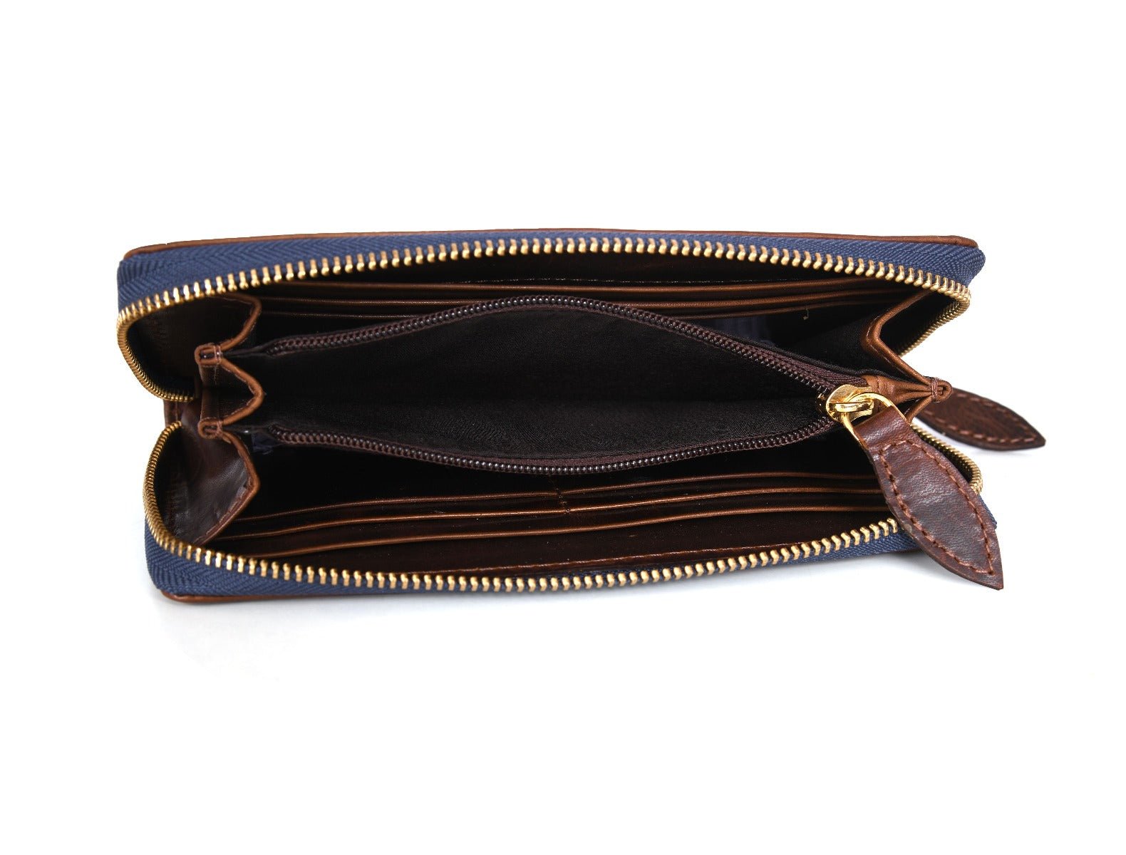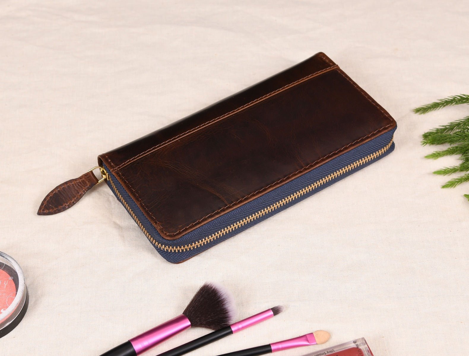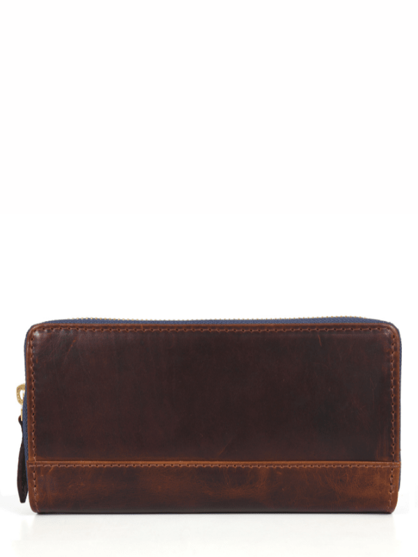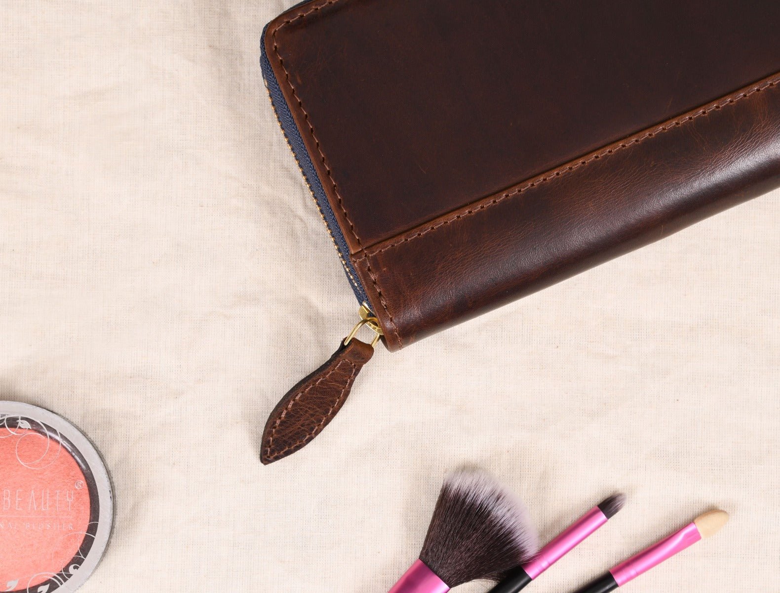 - The runner of the zipper is tied to a leather loop for easy opening and access to the inside content.
