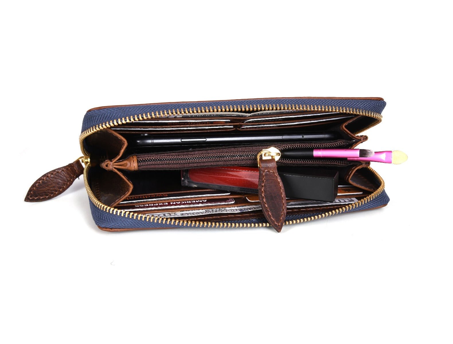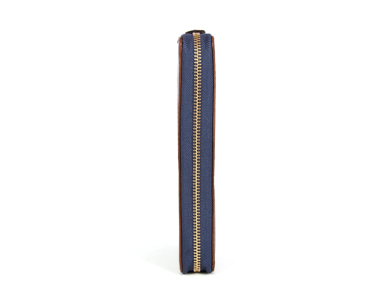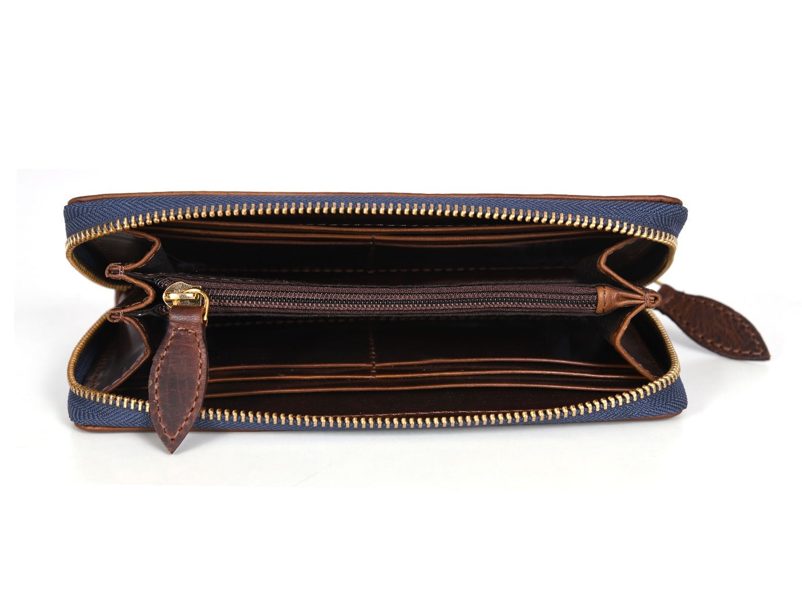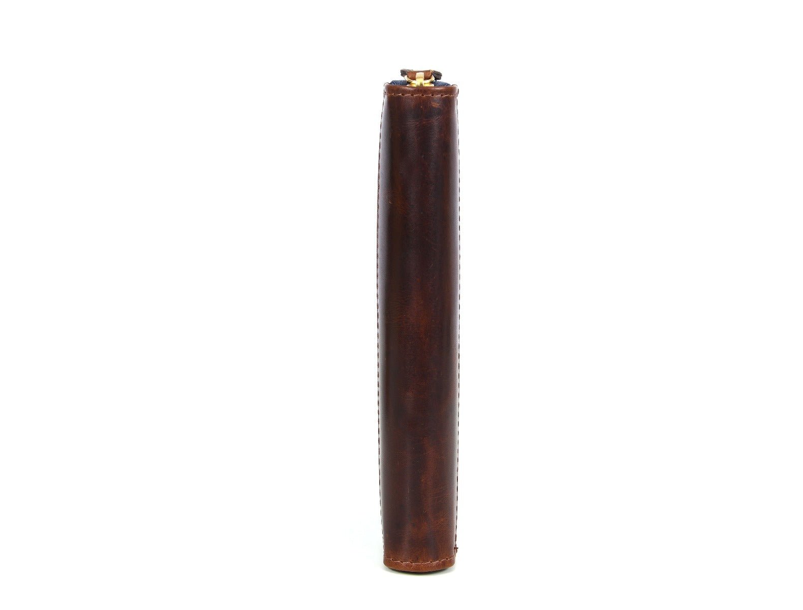 - The runner of the zipper is tied to a leather loop for easy opening and access to the inside content.