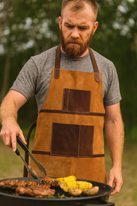 The Florence Suede Apron from Aaron Leather Goods is a One Size Fits utility Apron which has a diversified appeal from Chef's to Metal Forgers to Construction Workers to Home Cooking to Utility Workers. Ever wondered what reinforced stitching, high density water repellent waxed canvas, cross back straps and a personified design can do for the end product.