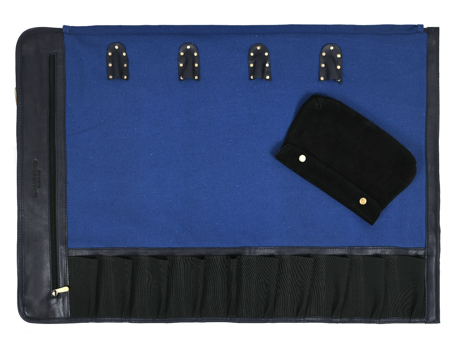- Stretchable Knife Pockets and Zipper Pouch to keep the Knives Secure. Leather Flaps are incorporated inside to further protect the knives from accidental damage, dust and moisture.