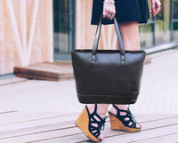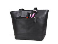- Our Leather Tote bag has 1 main compartment, 1 zip compartment on the inside of the bag, 1 laptop compartment, 1 wallet pocket, 1 cell phone pocket and 1 external zipper pocket. This bag also has an attractive key holder which gives you the feeling of owning a niche bag. A big compartment easily keep your cell phone, i Pad, MacBook, lipstick, compact mirror, sunscreen, perfume, business documents, and other important documents etc.