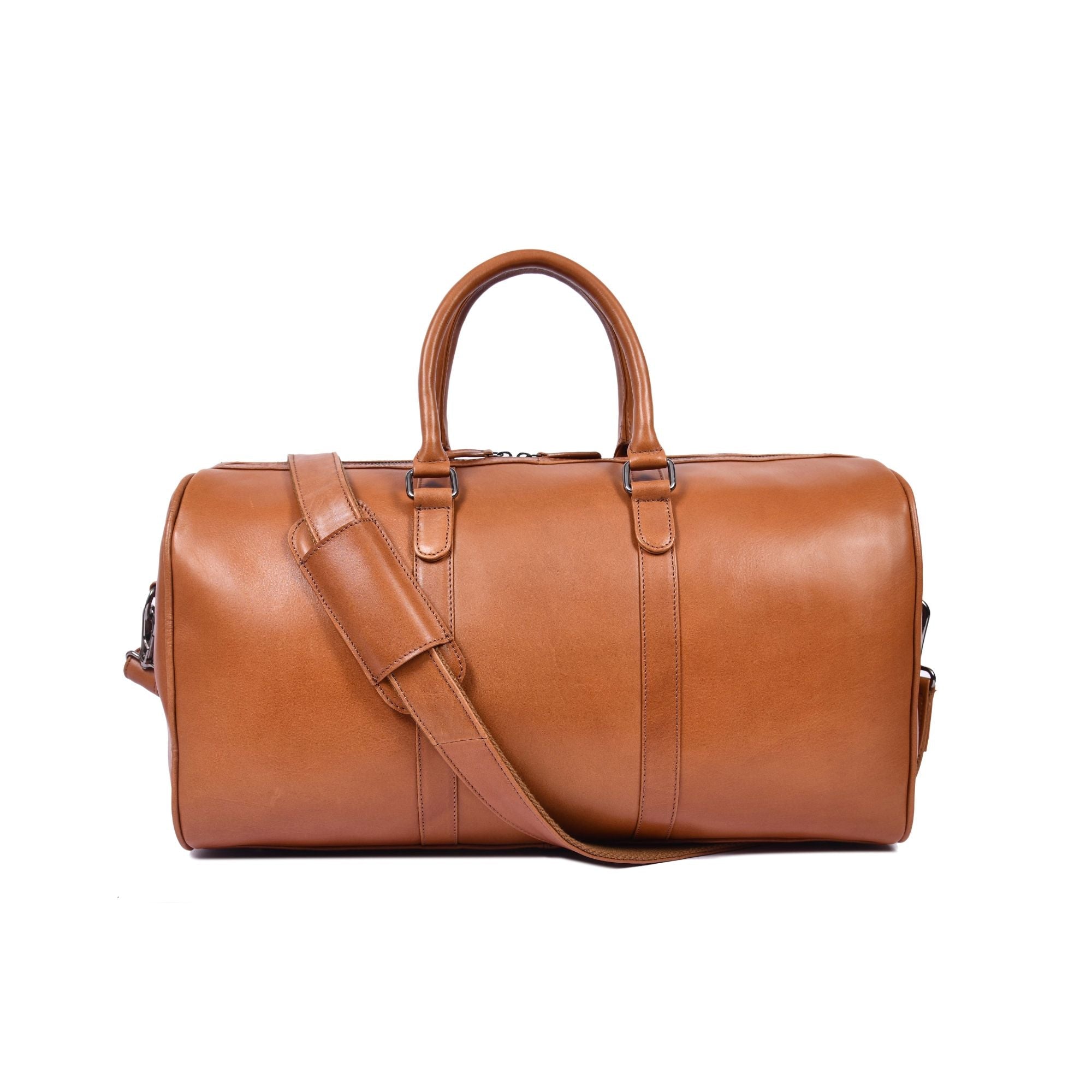 Crafted from premium full grain leather, this classic leather duffle bag combines timeless style with everyday practicality. Designed for travel, gym, or weekend getaways, it features a spacious main compartment to hold clothing, shoes, and essentials with ease. The smooth leather finish develops a rich patina over time, adding character with every use. Reinforced handles and a detachable, adjustable shoulder strap ensure comfortable carrying, while durable stitching and secure zipper closure provide long-lasting performance. A refined travel essential built for those who value durability, functionality, and understated luxury.