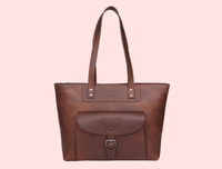 The bag includes two external pockets—a front buckle closure pocket with a gusset for cosmetics, iPads, and mobiles, and a back sleeve for documents, files, and other essentials. The pouch design serves as a single pocket for the internal compartment, featuring one large space with an all-leather side sleeve for wallets, cosmetics, and essentials.