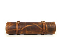 - Handcrafted from Premium Quality Leather and precision stitched by Skilled Craftsmen for durability and appeal. Twin Buckles Closure form a tight Roll along with a 2" Wide Webbed Shoulder Strap for ease in carrying the Knife Roll.