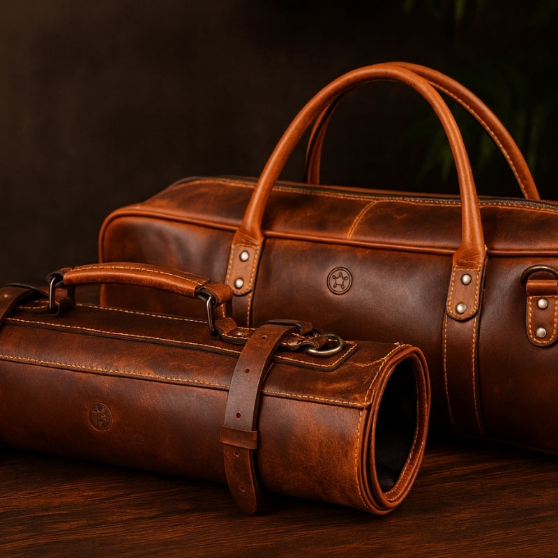Browse through our vibrant range of leather catalogs and choose your perfect leather product. From duffel bags to knife rollers, even aprons and backpacks, you have the option to select what tempts you.