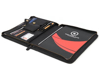 - Внутри с одной стороны дорожной папки находится блокнот на полиэстеровой подкладке с бесшовным кожаным карманом снизу для блокнота формата А4, файлов, держателя документов и т. д.