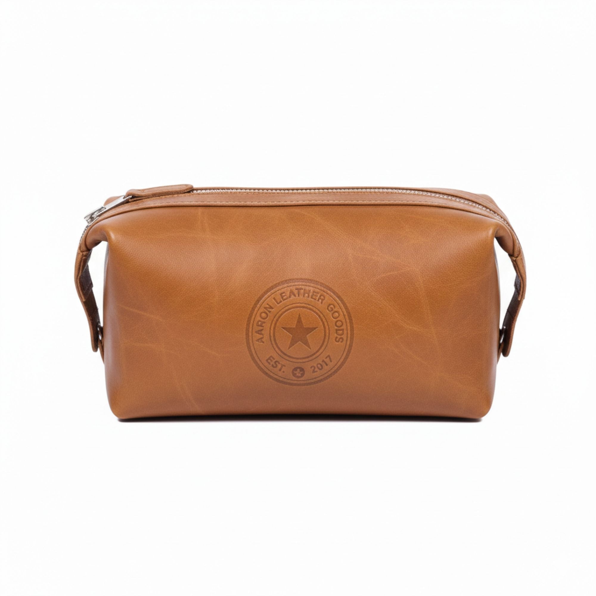 Tan Leather Toiletry Pouch with Zip Closure